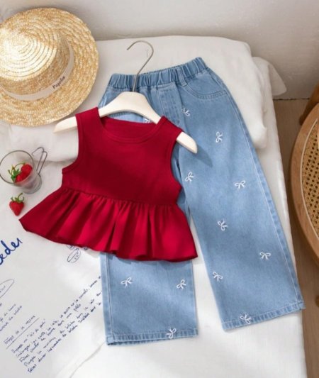 طقم قطعتين بلوزة مزينة بفيونكة كبيرة مع تنورة