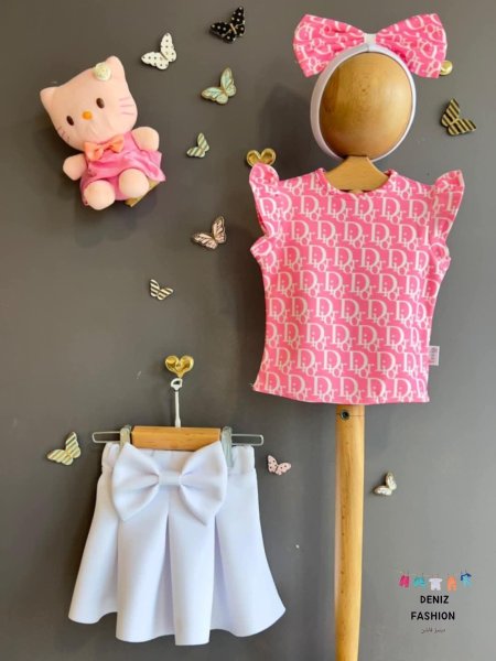 طقم قطعتين بلوزة مزينة بفيونكة كبيرة مع تنورة