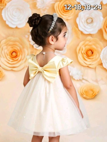 فستان بناتي ابيض بفيونكة كبيرة بالوسط فوشي مع بندانة فيونكة